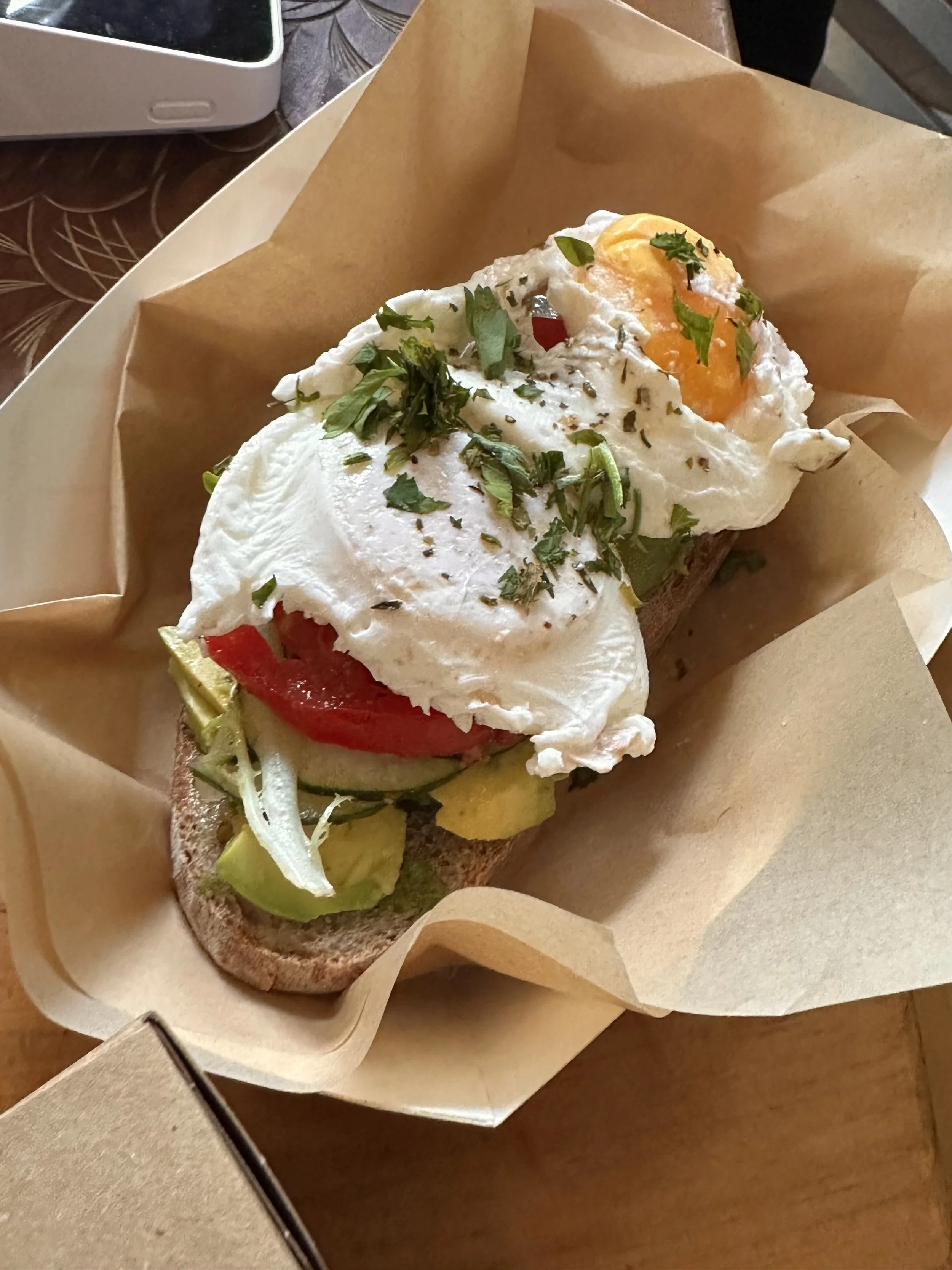 half an avocado, sliced, cucumber, tomato, poached egg, sea salt, lemon juice, parsley